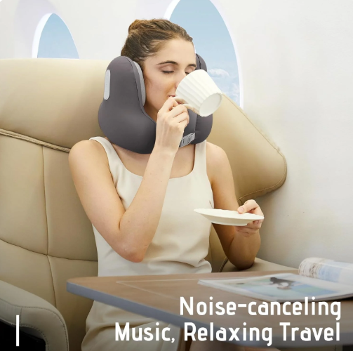 [24-hour delivery+Cash on delivery] Travel Neck Pillow with Bluetooth Headset, Memory Foam Airplane Pillow for Head Support, Ergonomic Design Traveling Music Pillow for Home, Flight, Car with Adjustable Buckle and Drawstring Bag(Grey)